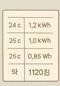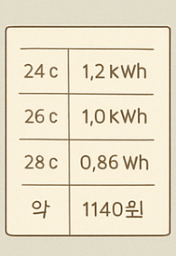 설정 온도 시간당 소비 전력 예상 전기세 24도 1.2kWh 약 170원 26도 1.0kWh 약 140원 28도 0.85kWh 약 120원 에어컨 전기세 절약법을 실천할 때 주의사항