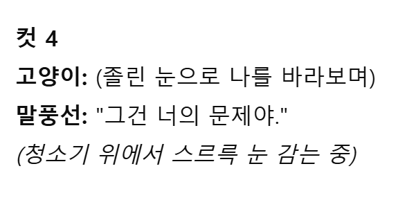 컷 4: 고양이: (졸린 표정) "그건 너의 문제야."제가 직접 이렇게 프롬프트를 넣었더니 아래와 같은 결과물이 나왔습니다.